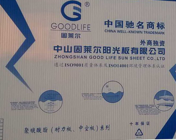 中山固莱尔阳光板有限公司成立于2000年,是国内发展早、规模大、销售网络广的外商投资企业,注册资本2300万港币。先后斥巨资引进目前世界最先进的意大利OMIPA 公司PC-UV共挤生产设备4条,采用优质纯正的德国拜耳公司Makrolon原材料和生产技术,投资总额超过一亿港元,专业生产PC阳光板和PC单层板,己通过瑞士SGS权威认证机构ISO9001-2008国际质量体系认证和ISO14000环保认证,美国ASTM检测,俄罗斯政府建材产品认证,美国热工性能检测,香港政府无害金属检测,等多项国际性认证和检测,还通过了国内防火性能检测,6500小时耐老化试验检测,隔音性能检测,防爆性能检测,物理性能检测,传热系数检测等。